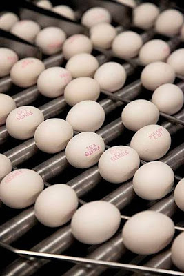 Par 30 à la fois les œufs sont placés sur un convoyeur dans